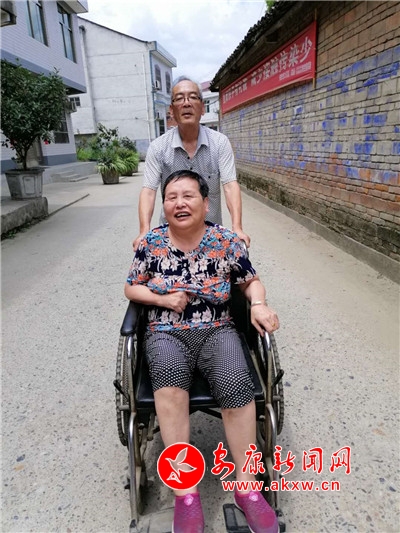 只要遇到好天氣,張業(yè)印就會用輪椅推著妻子到村部暢亮的大院巴上曬太陽,或一起到社區(qū)里鄰里之間串個(gè)門,一起聊家常;有時(shí)還會推著輪椅遠(yuǎn)到陜南民俗村第一村的魯家大院轉(zhuǎn)一轉(zhuǎn),讓妻子始終保持著愉悅的好心情。