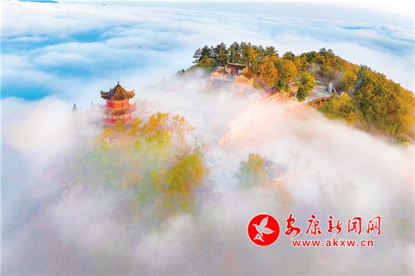 天柱山最美不過秋色,也是我在四季當(dāng)中頻繁上山的季節(jié)。每逢秋天,這里紅黃綠相間,漫山掛彩,在藍(lán)天的映襯下,多了幾分浪漫。從國道211起點(diǎn)的兩條上山公路,由數(shù)個“之”字連接起來,從湖邊一直盤旋至山頂?shù)陌自乒潘?,遠(yuǎn)眺仿佛一個大大的“人”字形飄帶。雨后放晴的頭兩個早晨,在云霧的籠罩下,天柱山的下半身連同湖面一并被巨大的“蠶絲被”覆蓋,山的上半身或山頭浮在云海之上,像是茫茫大海上的一座孤島。