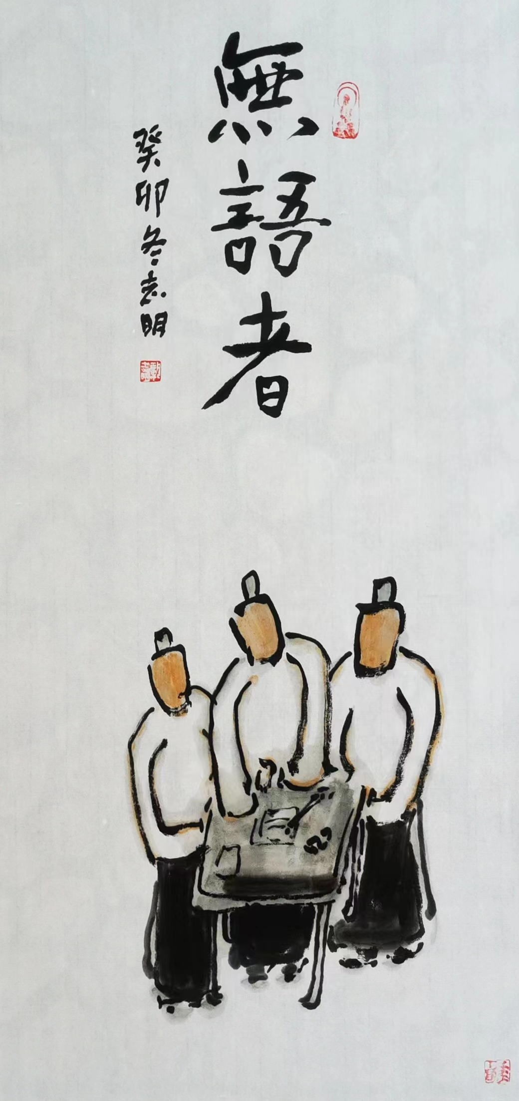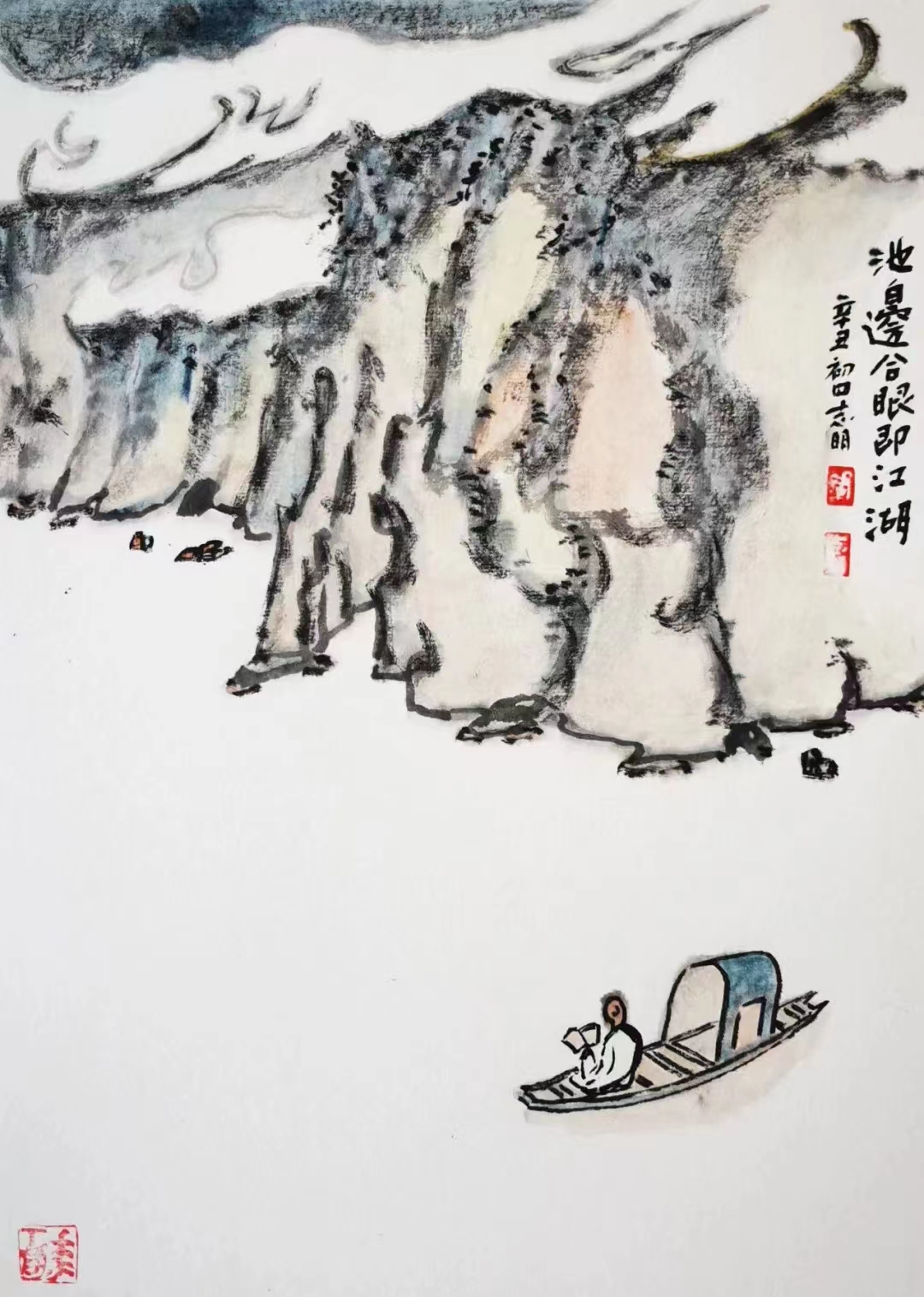記得那一年的端午節(jié),鞏志明發(fā)來短信,是他寫的一首詩:綠粽黃酒聚江邊,白帆紅燭祭屈原。三千清淚流不得,九萬渾念飄上天。誰有郁悶誰散淡,何謂圓滑何忠奸。十丈風(fēng)塵古今在,談笑真?zhèn)位聼煛?017年,我遷新居,鞏老師為我寄來小品畫《福到眼前》,我很喜歡,并懸掛至新居玄關(guān)。這些年,鞏志明老師常做影展畫展策劃及影評(píng)講座,自已也臨池不輟,水墨丹青,寄情抒懷,他的文人小品有思想性、有創(chuàng)造性。雖畫的是松風(fēng)明月,小舟流水或遠(yuǎn)古人物,但都寄托了他當(dāng)下的心境,以消塊壘。誠(chéng)如有人評(píng)論他為“吾師真文人,畫亦真性情!”他不僅只是身居畫室的怡情文人,他亦是心憂天下的豪俠。面對(duì)世間不平事,他也是激揚(yáng)文字,揮斥方遒!在功利的當(dāng)下,鞏志明尤其顯得難能可貴!?