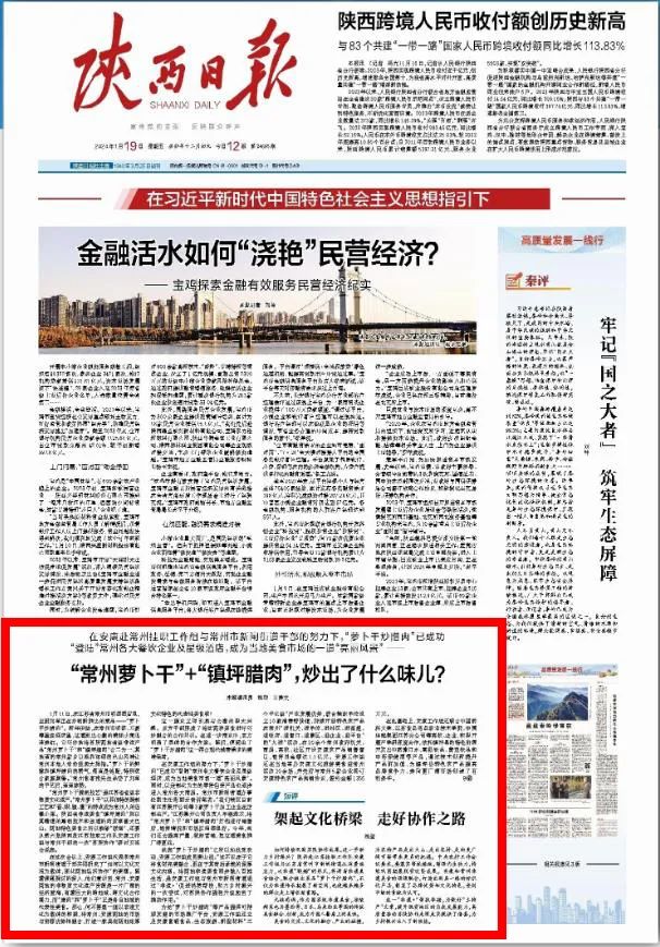 1月19日《陜西日報(bào)》頭版刊發(fā)文章《“常州蘿卜干”+“鎮(zhèn)坪臘肉”,炒出了什么味兒?》,報(bào)道鎮(zhèn)坪縣聯(lián)手常州市以文化賦能“土特產(chǎn)”,讓蘇陜協(xié)作更出彩!