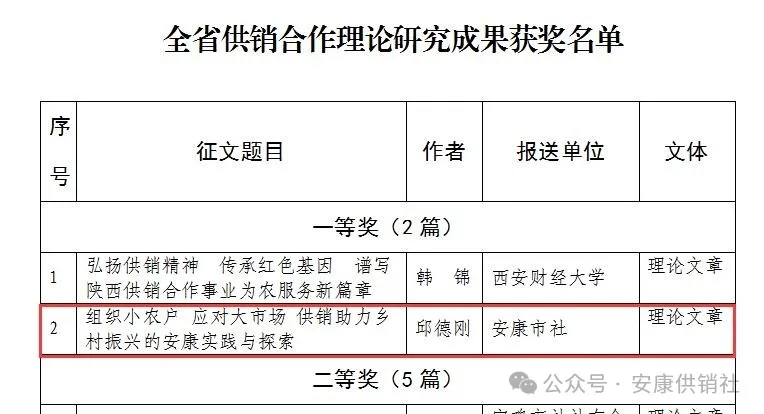 按:本文系安康市供銷合作社黨組書(shū)記、理事會(huì)主任邱德剛署名理論文章,立足供銷助力鄉(xiāng)村振興的安康實(shí)踐與探索,深入闡述了“組織小農(nóng)戶應(yīng)對(duì)大市場(chǎng)”的內(nèi)在邏輯,把群眾“組織起來(lái)”投身經(jīng)濟(jì)合作的實(shí)踐方法,在助力鄉(xiāng)村振興、推進(jìn)共同富裕實(shí)踐中探索出一條可復(fù)制可推廣的典型經(jīng)驗(yàn),其理論內(nèi)涵、實(shí)踐邏輯為在推進(jìn)鄉(xiāng)村振興中更好發(fā)揮供銷社的獨(dú)特優(yōu)勢(shì)和重要作用提供了有益參考,具有較強(qiáng)的指導(dǎo)意義。該文在中華全國(guó)供銷總社和陜西省供銷總社“薪火相傳七十載,砥礪奮進(jìn)新時(shí)代”主題征文中獲評(píng)“全省供銷合作理論研究成果一等獎(jiǎng)”。