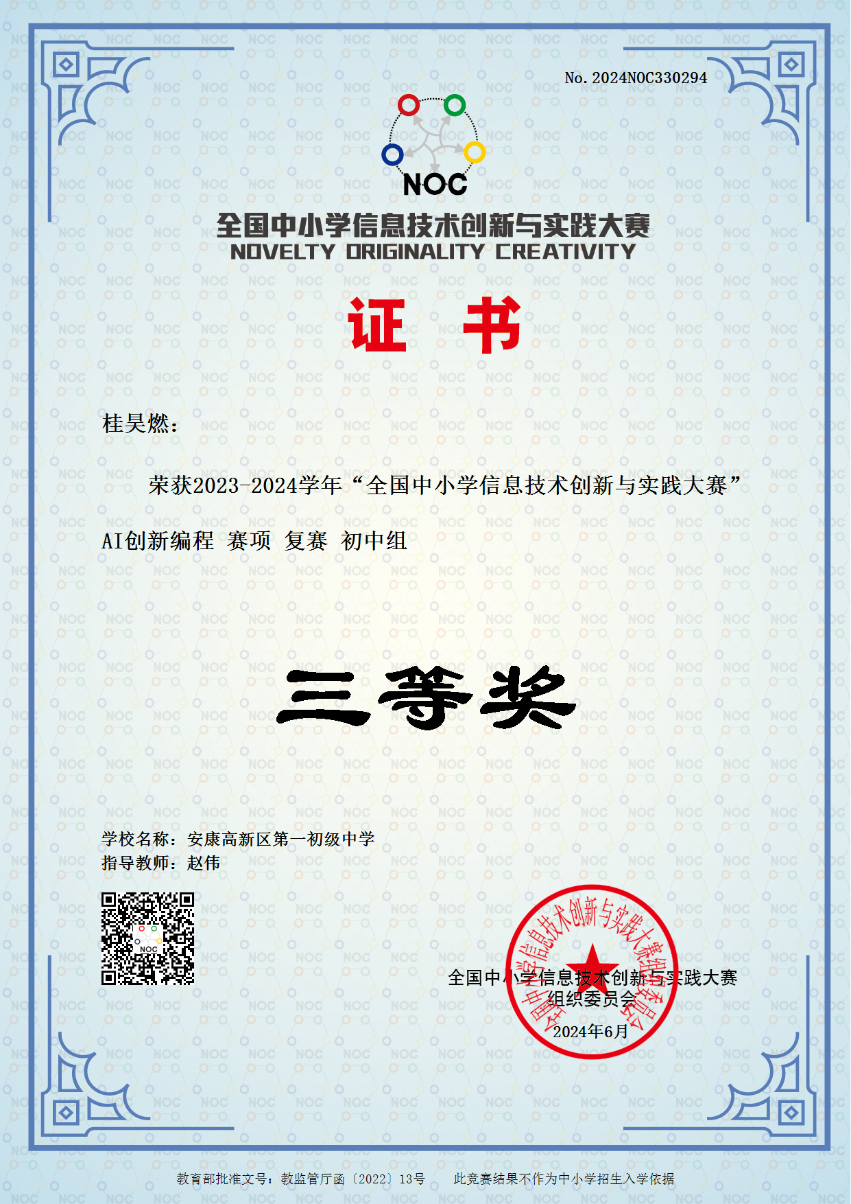 據(jù)悉,“全國中小學(xué)信息技術(shù)創(chuàng)新與實(shí)踐大賽(NOC,全稱為Novelty, Originality, Creativity)”是全國性的權(quán)威賽事,屬教育部白名單賽事,是一項(xiàng)運(yùn)用信息技術(shù),培養(yǎng)廣大師生的創(chuàng)新精神和實(shí)踐能力,面向青少年學(xué)生開展人工智能科學(xué)普及、引領(lǐng)科技創(chuàng)新的素質(zhì)教育實(shí)踐平臺(tái)。??