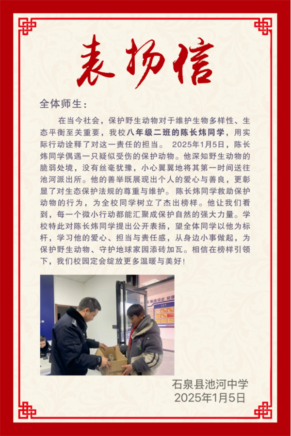 陳長煒的暖心事跡傳到學校后,學校發(fā)布了表揚信,公開表揚陳長煒同學的愛心善舉和保護野生動物的暖心行為。號召全體學生要學習陳長煒的愛心、責任和擔當,從小事做起,從自身做起,保護野生動植物,為保護地球家園、尊重生態(tài)文明的多樣性貢獻力量。?
