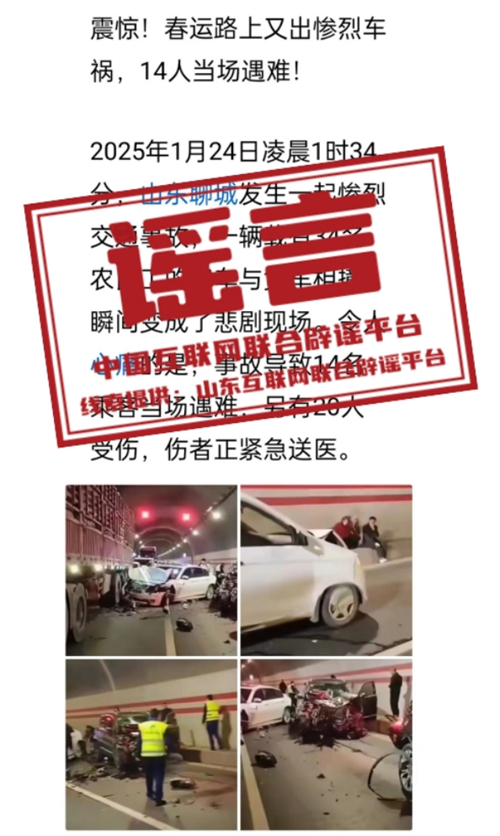 真相:近日,有網(wǎng)民在網(wǎng)絡(luò)平臺發(fā)布一則“山東聊城一隧道內(nèi)發(fā)生多車相撞”的信息,稱“現(xiàn)場多車發(fā)生嚴(yán)重碰撞,場面慘烈,群眾滯留”,引發(fā)關(guān)注。經(jīng)當(dāng)?shù)鼐胶藢崳綎|省聊城市從未發(fā)生過類似交通事故,該信息內(nèi)容純屬虛假編造。經(jīng)查,網(wǎng)民褚某某和韓某為博取關(guān)注、吸引流量,將外省市發(fā)生交通事故的圖片視頻移花接木,稱“聊城發(fā)生交通事故”并憑空捏造傷亡人數(shù),造成不良影響。目前,二人已被公安機(jī)關(guān)依法打擊處理。(來源:山東互聯(lián)網(wǎng)聯(lián)合辟謠平臺、聊城市網(wǎng)上辟謠平臺)