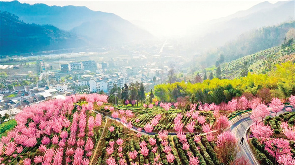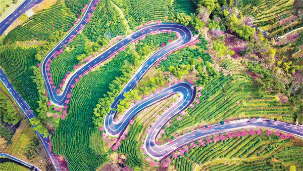 沿著茶山步道拾級(jí)而上,茶農(nóng)采青的竹簍與游人拍照的紗巾在梯田間次第閃現(xiàn)。粉白相間的梅花如云絮般綴滿(mǎn)枝頭,風(fēng)過(guò)處,花瓣簌簌落入茶叢,為嫩綠的新芽染上淡淡馨香。遠(yuǎn)處黛瓦白墻的徽派民居與近處起伏的茶壟構(gòu)成天然畫(huà)框,無(wú)人機(jī)視角下,蜿蜒的茶道如同玉帶纏繞山腰,將紅楓、櫻花、梅林串成斑斕的珠鏈。