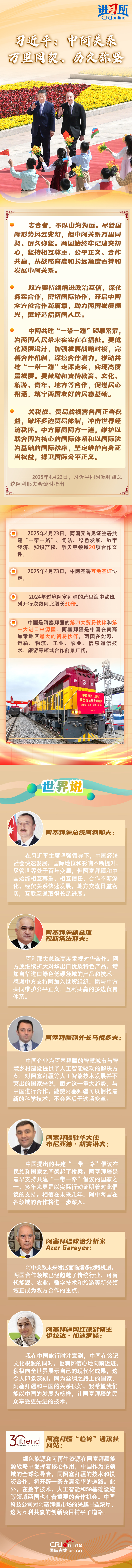4月23日,中國國家主席習(xí)近平在北京同阿塞拜疆總統(tǒng)阿利耶夫舉行會談。兩國元首宣布,建立中阿全面戰(zhàn)略伙伴關(guān)系。習(xí)近平指出,盡管國際形勢風(fēng)云變幻,但中阿關(guān)系萬里同契、歷久彌堅。雙方要持續(xù)增進政治互信,深化務(wù)實合作,密切國際協(xié)作,開啟中阿全方位合作新篇章,助力兩國發(fā)展振興,更好造福兩國人民。