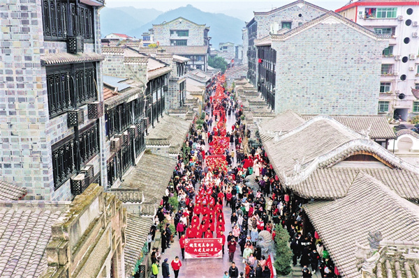 一縷微風穿過,黃昏的老街各種顏色交織碰撞,給人無限遐想。街道兩旁,店鋪一家挨著一家,幾家店外排著長隊,生意火爆。漢服、旗袍走秀、火獅子、舞龍、漢調(diào)二黃、花鼓戲入眼入耳?;秀遍g,昔日的場景猶如一幅畫卷徐徐展開。