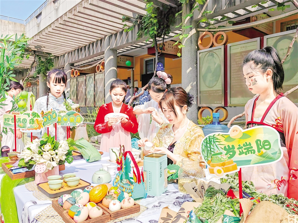 學生們身著漢服與“我們的節(jié)日·端午”主題文化節(jié)背景墻合影