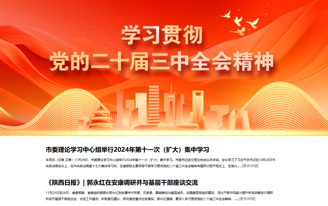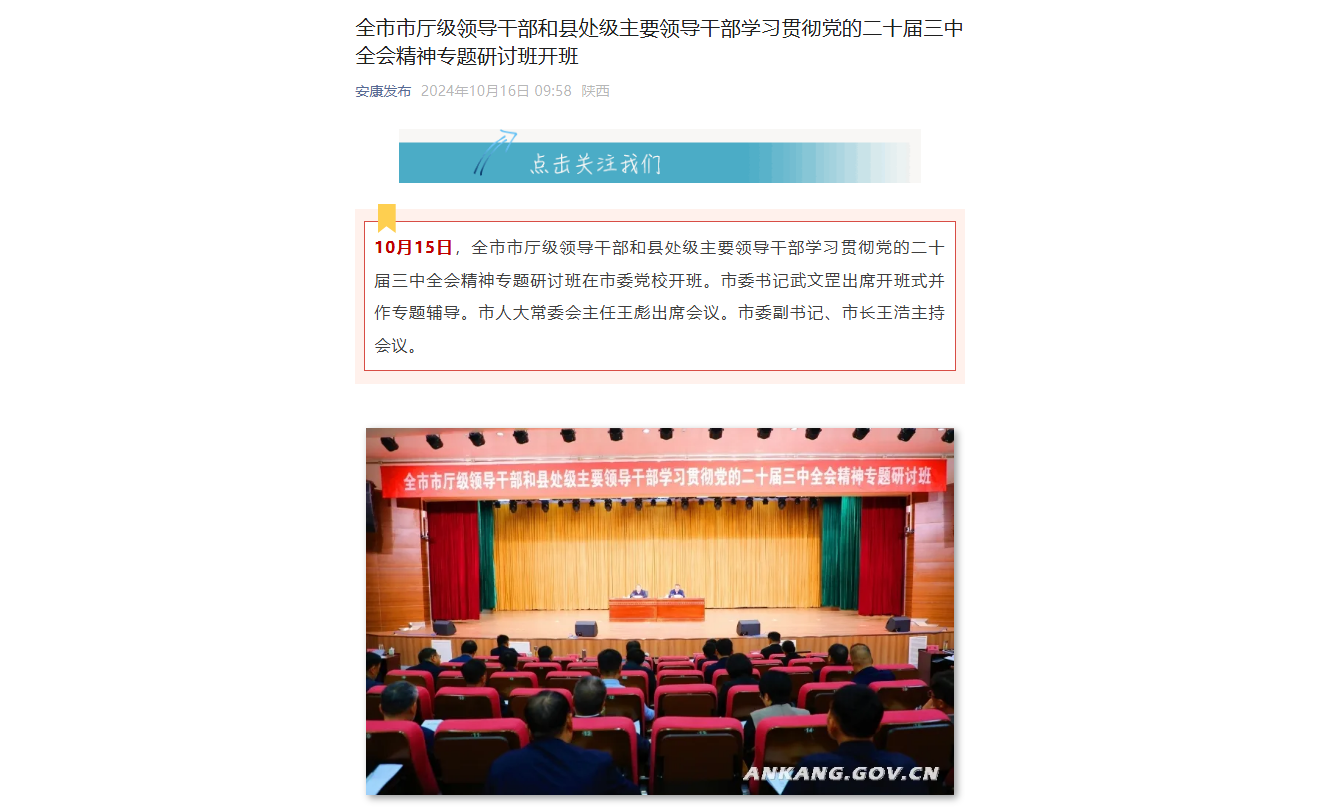 《全市市廳級(jí)領(lǐng)導(dǎo)干部和縣處級(jí)主要領(lǐng)導(dǎo)干部學(xué)習(xí)貫徹黨的二十屆三中全會(huì)精神專(zhuān)題研討班開(kāi)班》(2024-10-16發(fā)布于安康發(fā)布公眾號(hào))
