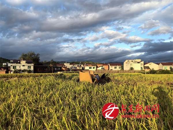 走進(jìn)新河村,陽光灑在沉甸甸的稻穗上,飽滿的谷粒泛著金黃光澤。微風(fēng)拂過,連片稻田掀起層層稻浪,裹挾著清新的谷物香氣彌漫田間。稻田里,農(nóng)機(jī)手熟練地操控著收割機(jī),在田間來回穿梭,機(jī)身所過之處,水稻快速完成脫粒、秸稈分離,金黃的稻谷源源不斷送入機(jī)倉,實現(xiàn)顆粒歸倉;為進(jìn)一步加快水稻收割進(jìn)度,幾位村民則支起拌桶,手持稻把用力拍打,沿用傳統(tǒng)打谷技藝同步搶收,機(jī)器轟鳴聲、打谷聲與村民的歡聲笑語交織成秋日豐收的“協(xié)奏曲”。
