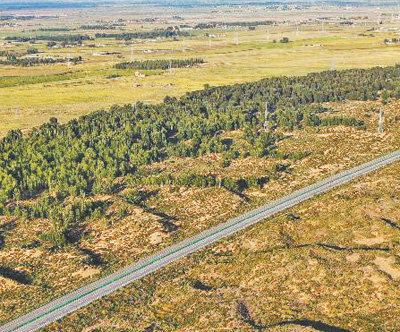 “十四五”時期,“三北”工程攻堅(jiān)戰(zhàn)取得階段性成效。圖為內(nèi)蒙古庫布其沙漠北緣鎖邊林帶。新華社記者 李志鵬攝