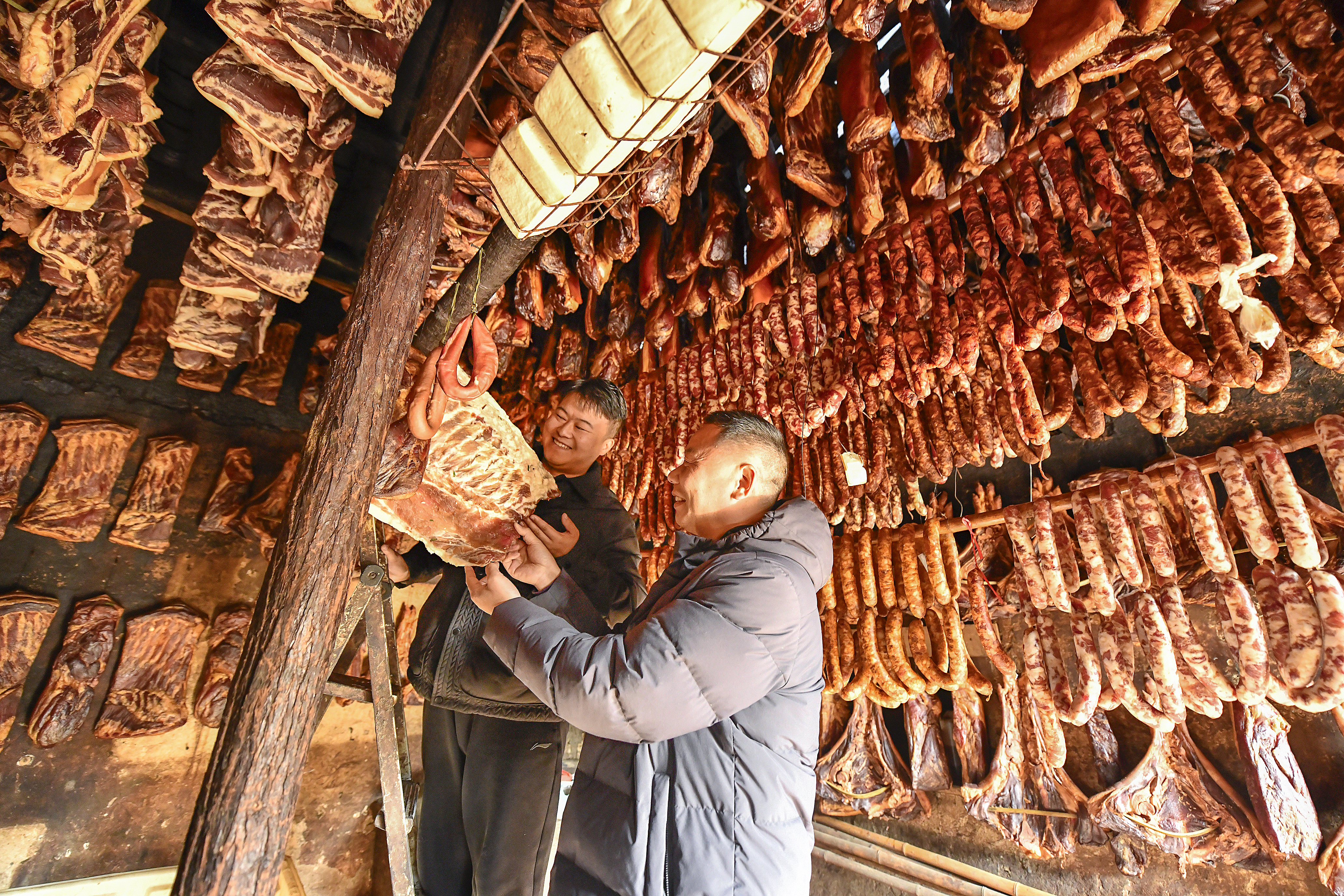 12月29日,走進(jìn)石泉縣城關(guān)鎮(zhèn)珍珠河村王全勇家,臘肉、香腸整齊懸掛,紅亮油潤(rùn)。近年來(lái),珍珠河村以集體經(jīng)濟(jì)合作社牽頭,發(fā)動(dòng)返鄉(xiāng)能人,在安全前提下,以古法烘制臘肉、香腸等特色“年貨”,年均出產(chǎn)臘肉6萬(wàn)余斤,持續(xù)做強(qiáng)本土“臘味”經(jīng)濟(jì),多渠道助農(nóng)增收。