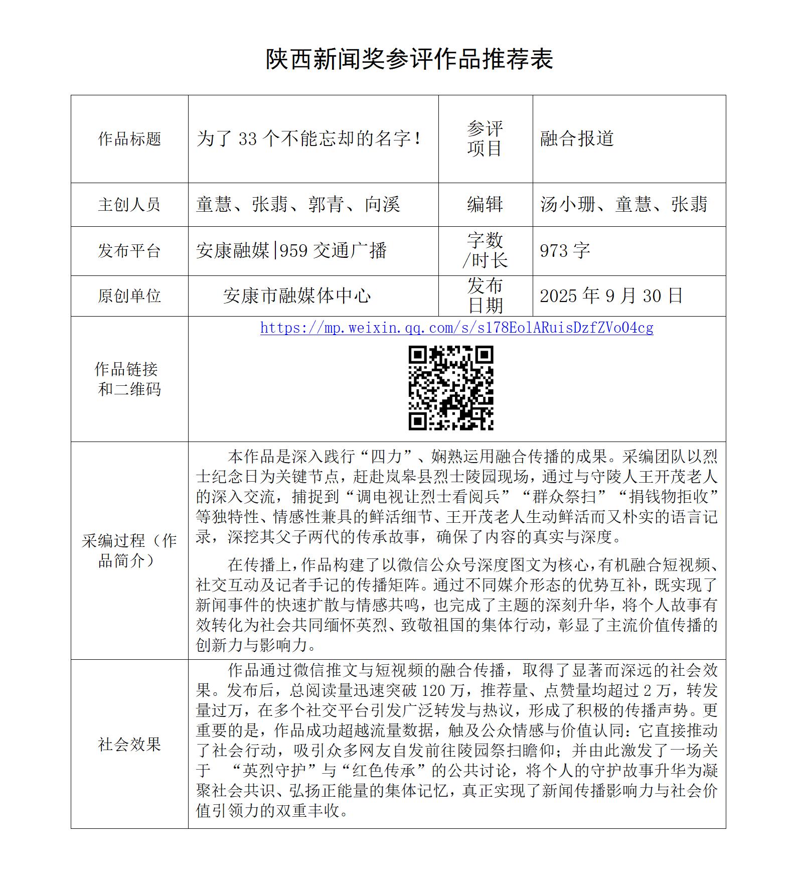 根據(jù)《陜西新聞獎、陜西省優(yōu)秀新聞工作者評選辦法》和《關(guān)于開展2025年度陜西新聞獎融合報道、應(yīng)用創(chuàng)新和新媒體新聞專欄作品推優(yōu)工作的通知》要求,經(jīng)個人申報、部門推薦和中心編委會嚴(yán)格篩選,對以下3件2025年度陜西新聞獎融合報道、應(yīng)用創(chuàng)新、新媒體新聞專欄參評作品進(jìn)行公示。(作品推薦表附后)