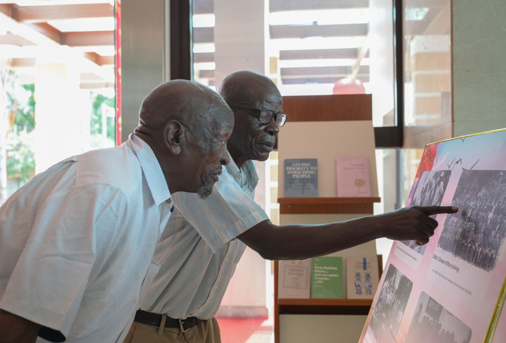 1月28日,在津巴布韋首都哈拉雷的中國(guó)大使館,兩名曾在中國(guó)接受培訓(xùn)的津巴布韋老戰(zhàn)士在展板老照片上尋找自己。當(dāng)日,大使館舉行向津巴布韋解放斗爭(zhēng)老戰(zhàn)士轉(zhuǎn)交習(xí)近平主席復(fù)信活動(dòng)。新華社記者 楊光 攝