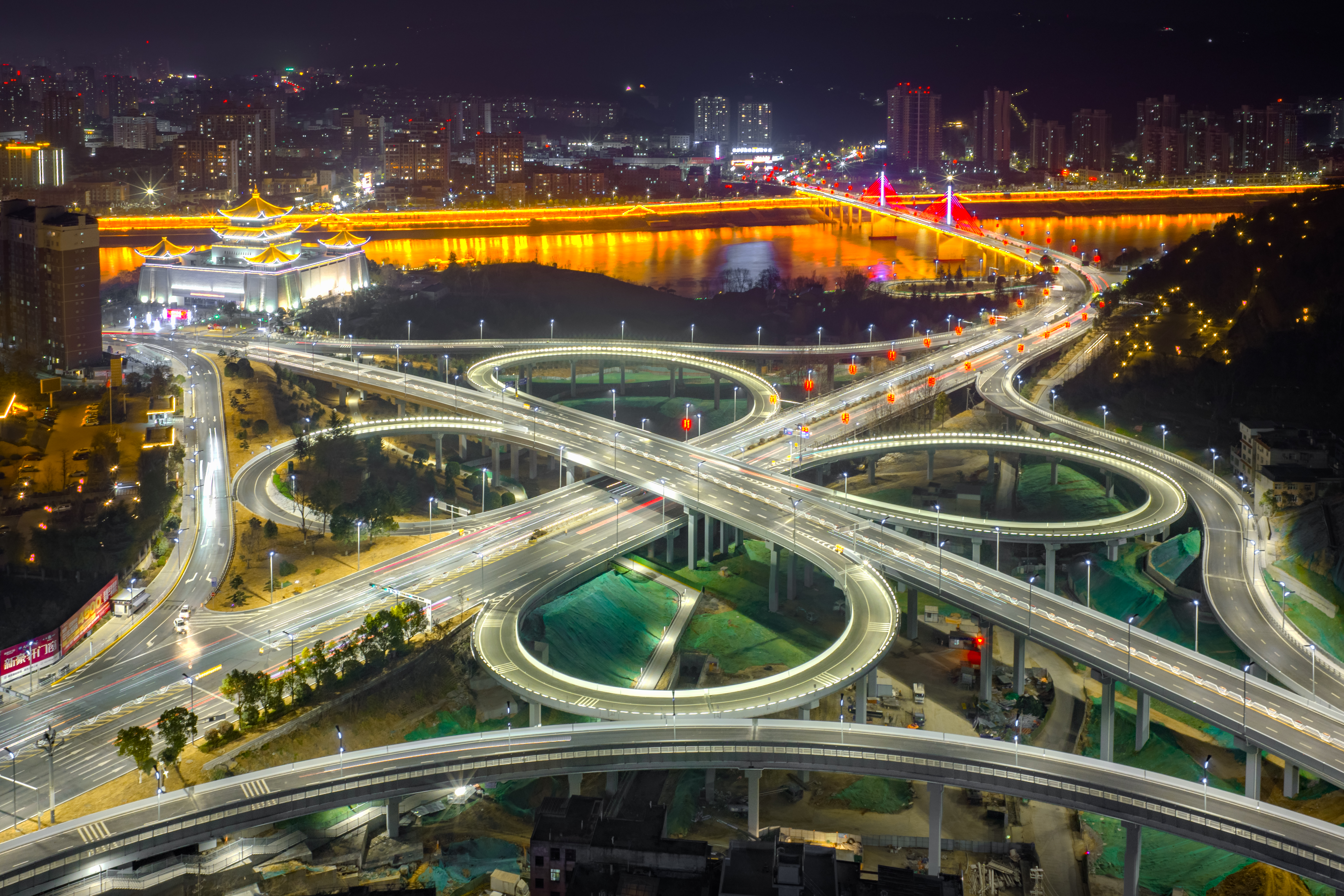 夜晚的七里溝立交,流光溢彩,匝道如銀鏈交織,與漢江粼粼波光彼此輝映,共同勾勒出一幅流動的城市發(fā)展畫卷。唐軍 攝