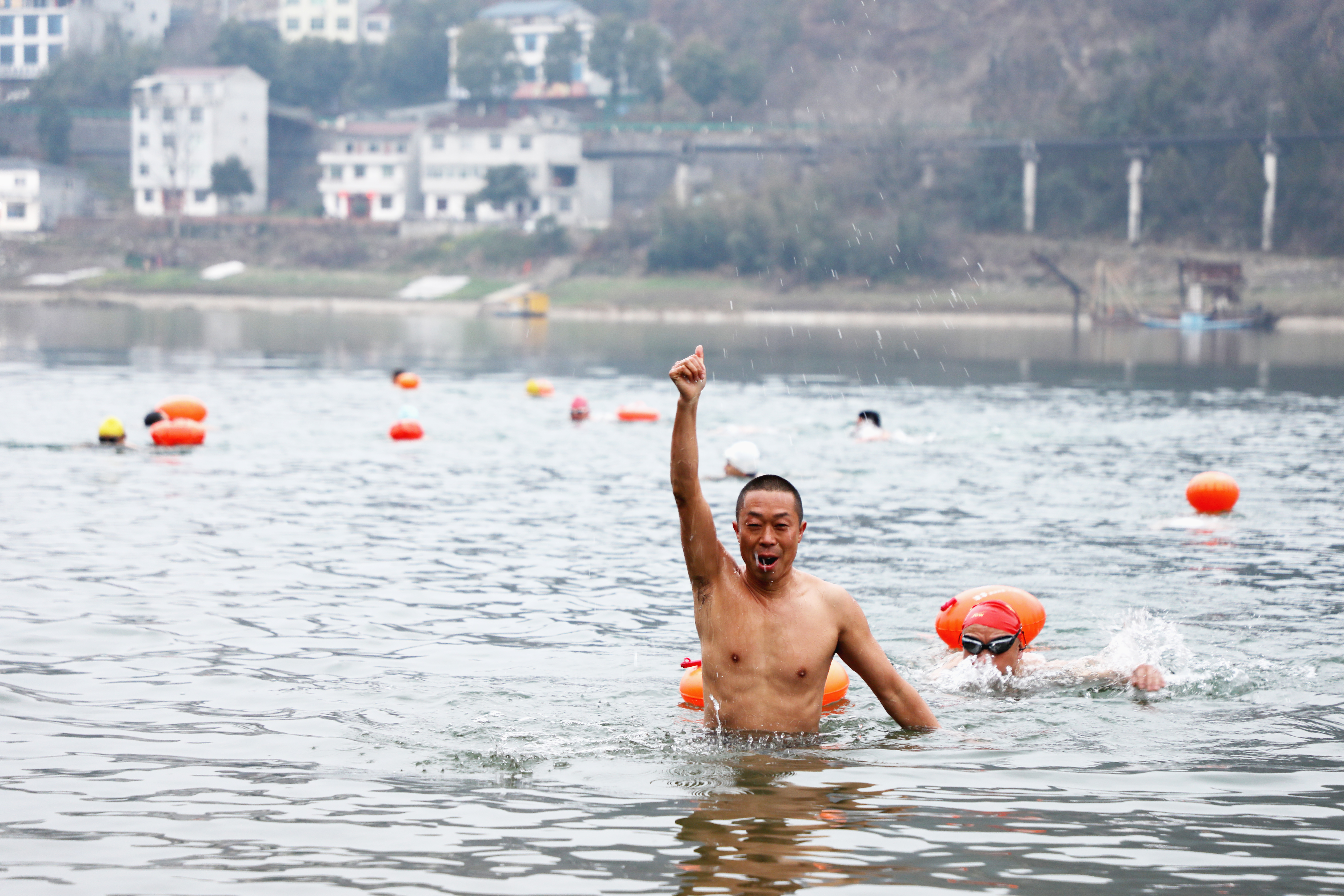 ⑩ 利用春節(jié)假期,冬泳愛(ài)好者暢游漢江。王 謐 攝