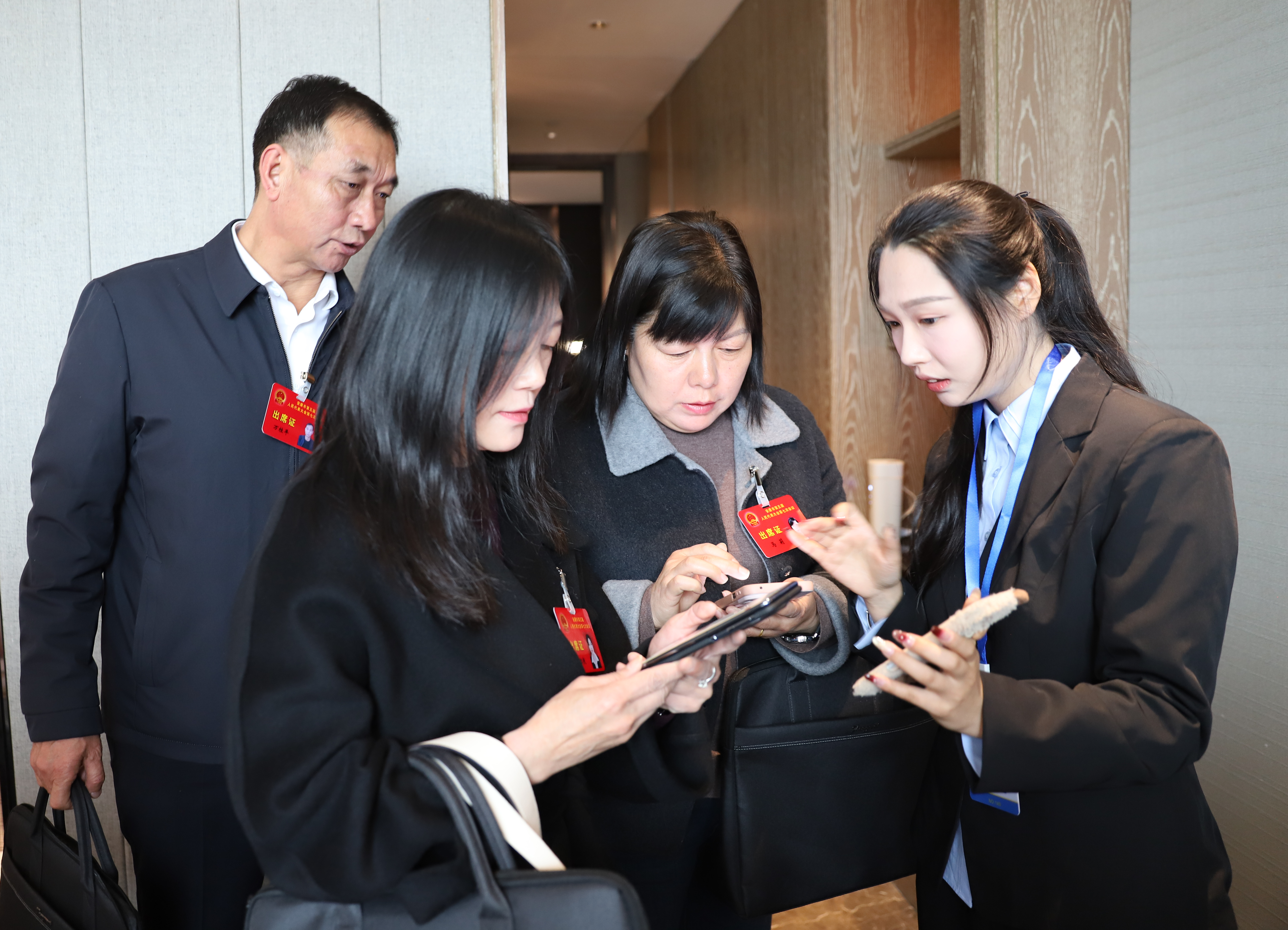 2月27日上午,出席市五屆人大七次會(huì)議的人大代表陸續(xù)抵達(dá)駐地向大會(huì)報(bào)到。圖為現(xiàn)場(chǎng)工作人員向代表們演示新上線的“安康數(shù)字人大”微信小程序。記者 魏濤 攝