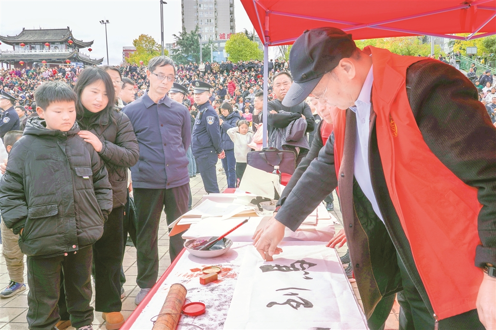 市集不僅有宣傳與服務(wù),更有可看可學(xué)的文明實(shí)踐?;顒油ㄟ^宣傳展板集中展示漢濱區(qū)移風(fēng)易俗成果與文明新風(fēng)先進(jìn)典型事跡,用身邊人、身邊事帶動群眾。非遺代表性傳承人現(xiàn)場詮釋勤儉美德,書法愛好者現(xiàn)場書寫福字與家訓(xùn),讓群眾在傳統(tǒng)文化熏陶中,潛移默化地接受新風(fēng)教育?!胺沁z、書法和移風(fēng)易俗結(jié)合得好,孩子也能受教育?!睅е⒆庸涫屑氖忻窭钆渴斋@滿滿、笑意盈盈。