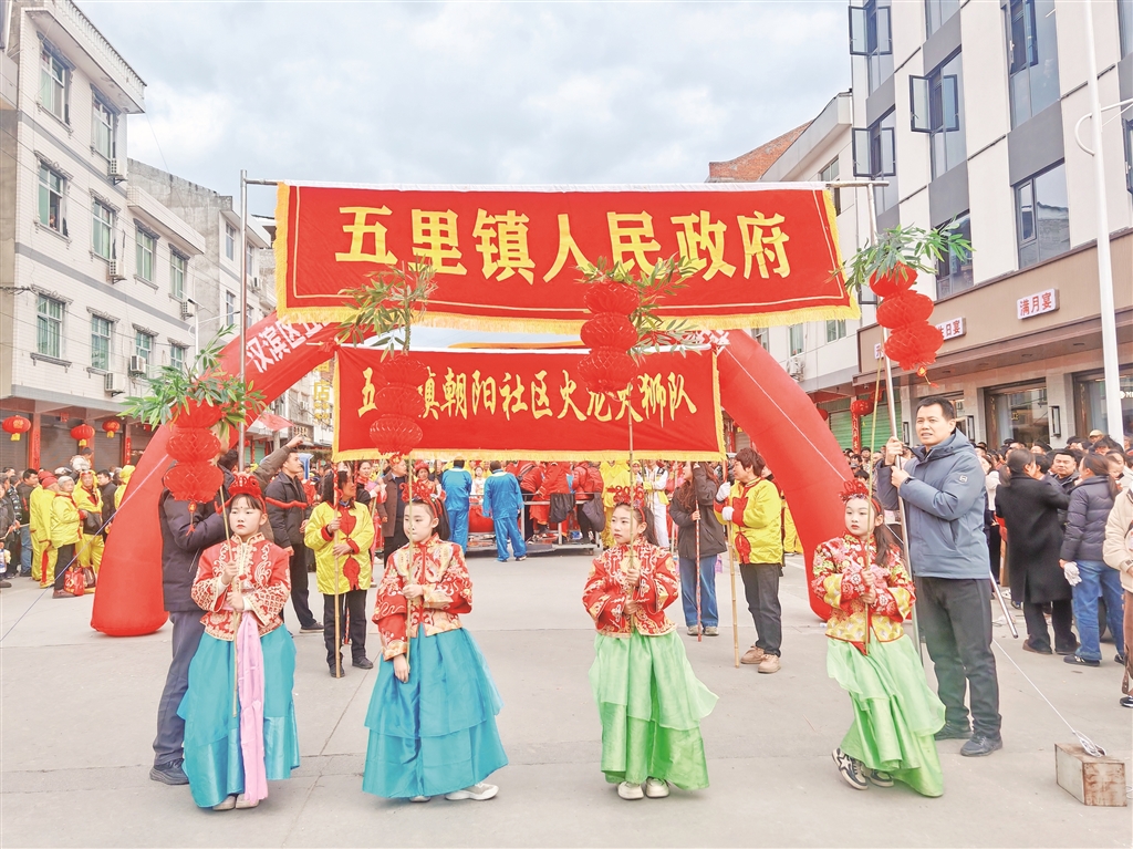 展演結束后,火龍、火獅和采蓮船等展演隊伍也被五里工業(yè)集中區(qū)企業(yè)邀請進行表演。在鏗鏘鑼鼓聲中,歡騰民俗在現(xiàn)代化廠區(qū)生動呈現(xiàn),職工們駐足觀看、掌聲不斷,處處洋溢著喜慶祥和、昂揚向上的濃厚氛圍。