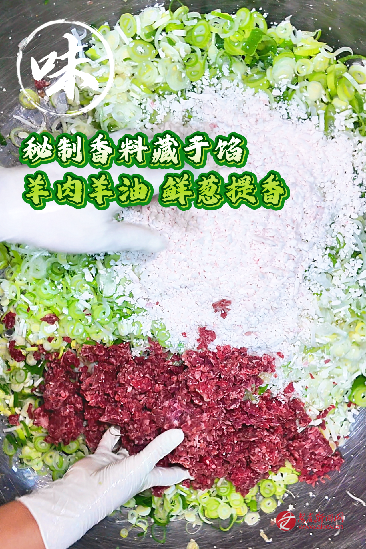 再是做油酥。抓一把面粉,擱碗里,加鹽、五香粉,用滾沸的熟油潑進(jìn)去,筷子急急地?cái)嚒D敲嬖谟屠飭陠甑仨懀瑵u漸融成濃稠的一團(tuán)。這油酥,是餅子起層的秘密。還有餡料。羊肉選用本地的羊,肉切成小小的丁。太肥了不行,須得瘦肉多一些,得加些羊脂丁,那樣煎出來(lái)才潤(rùn),才有汁水。蔥花要多,要本地的蔥,切得碎碎的,拌上鹽、花椒粉、五香粉。有的還加焙香的苜蓿末,黃黃的,有股子清野的氣味。