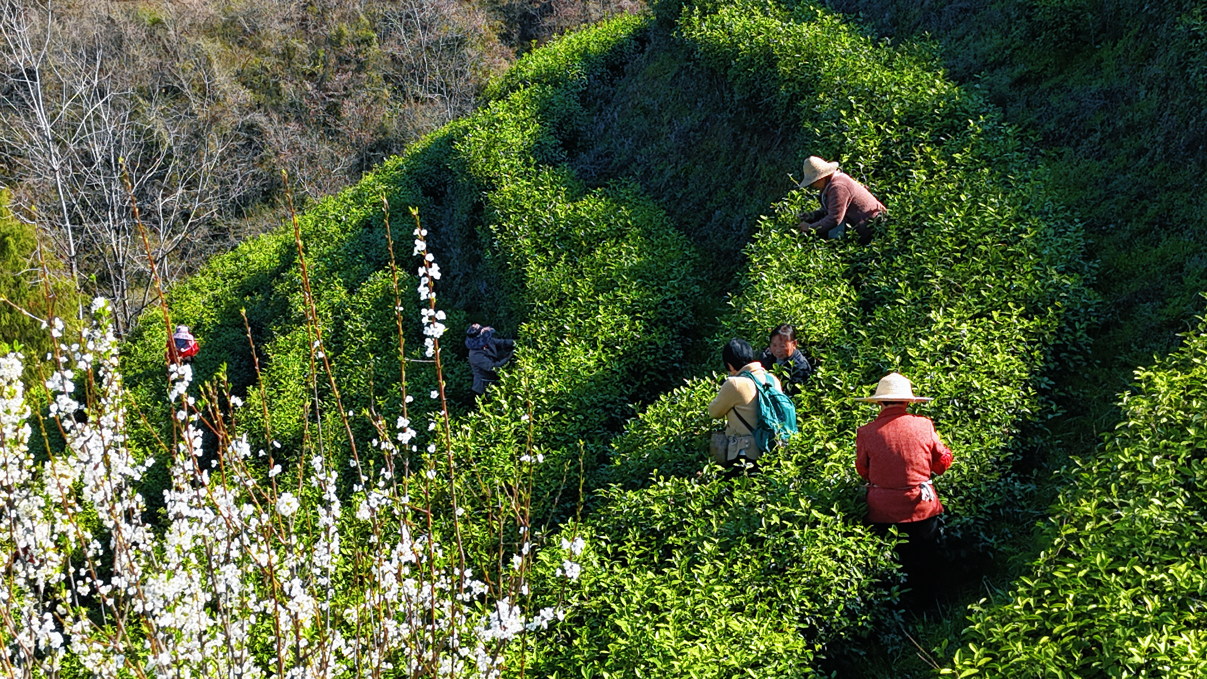 3月17日,在漢陰縣漩渦鎮(zhèn)發(fā)揚(yáng)村茶園,茶農(nóng)們腰挎竹簍,在茶壟間嫻熟地采摘著今年的頭茬春茶。該茶園總面積860畝,全年產(chǎn)值穩(wěn)定在650萬元左右。王建霞 攝