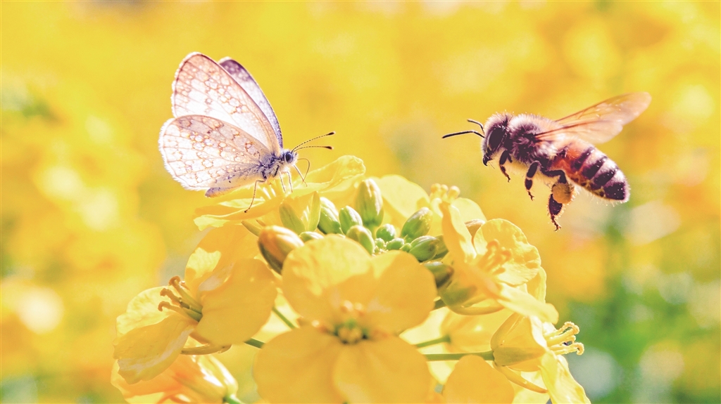 盛放的油菜花叢中,蜜蜂、蝴蝶翩翩起舞。
