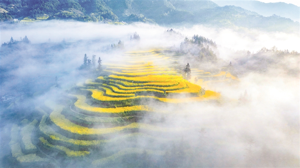 沿著蜿蜒的山路盤旋而上,轉(zhuǎn)過(guò)一個(gè)山坳,眼前豁然開(kāi)朗——那金黃的油菜花,竟從山腳一直鋪到云端。層層疊疊的梯田,依著山勢(shì)盤旋而上,每一道田埂都勾勒出柔美的曲線。油菜花便順著這些曲線,開(kāi)得浩浩蕩蕩,開(kāi)得理直氣壯。晨霧未散時(shí),花海在薄紗般的霧氣里若隱若現(xiàn),恍若仙境;待太陽(yáng)升高,霧氣褪去,那金黃便愈發(fā)耀眼,直晃得人瞇起眼睛。風(fēng)過(guò)處,花浪翻涌,從這山傳到那山,沙沙的聲響里,滿是春天的氣息。