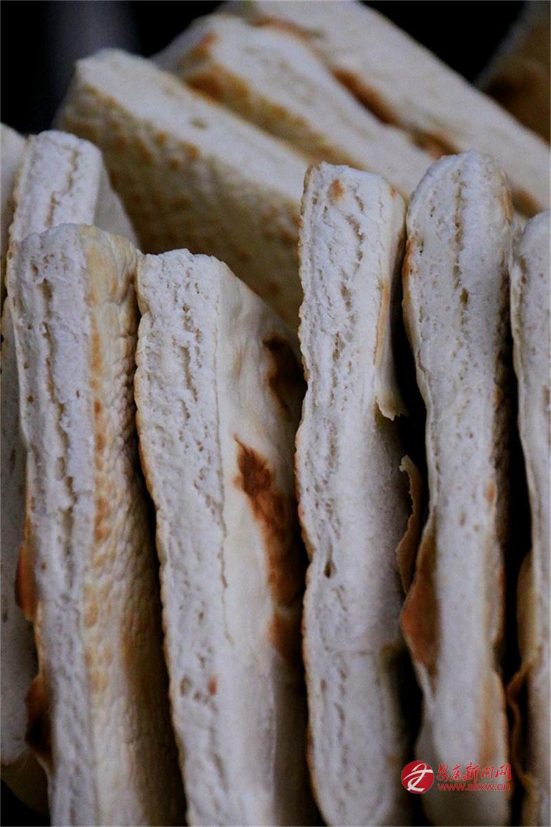 安康的牙牙兒饃是發(fā)面的。發(fā)面,在北方多用于蒸饅頭、包子,用來打饃且泡在湯里吃的,似乎不多見。安康人卻偏偏這么做了。面粉加了酵母,醒得恰到好處,不能太酸,也不能太生,揉成團,搟成圓,在鏊子上烙?;鸷蛞m中,兩面烙得焦黃,帶著些許褐色的斑點,像是虎背上的花紋,雖不如西安饦饦饃那般白凈,卻多了一股子麥香和火氣。