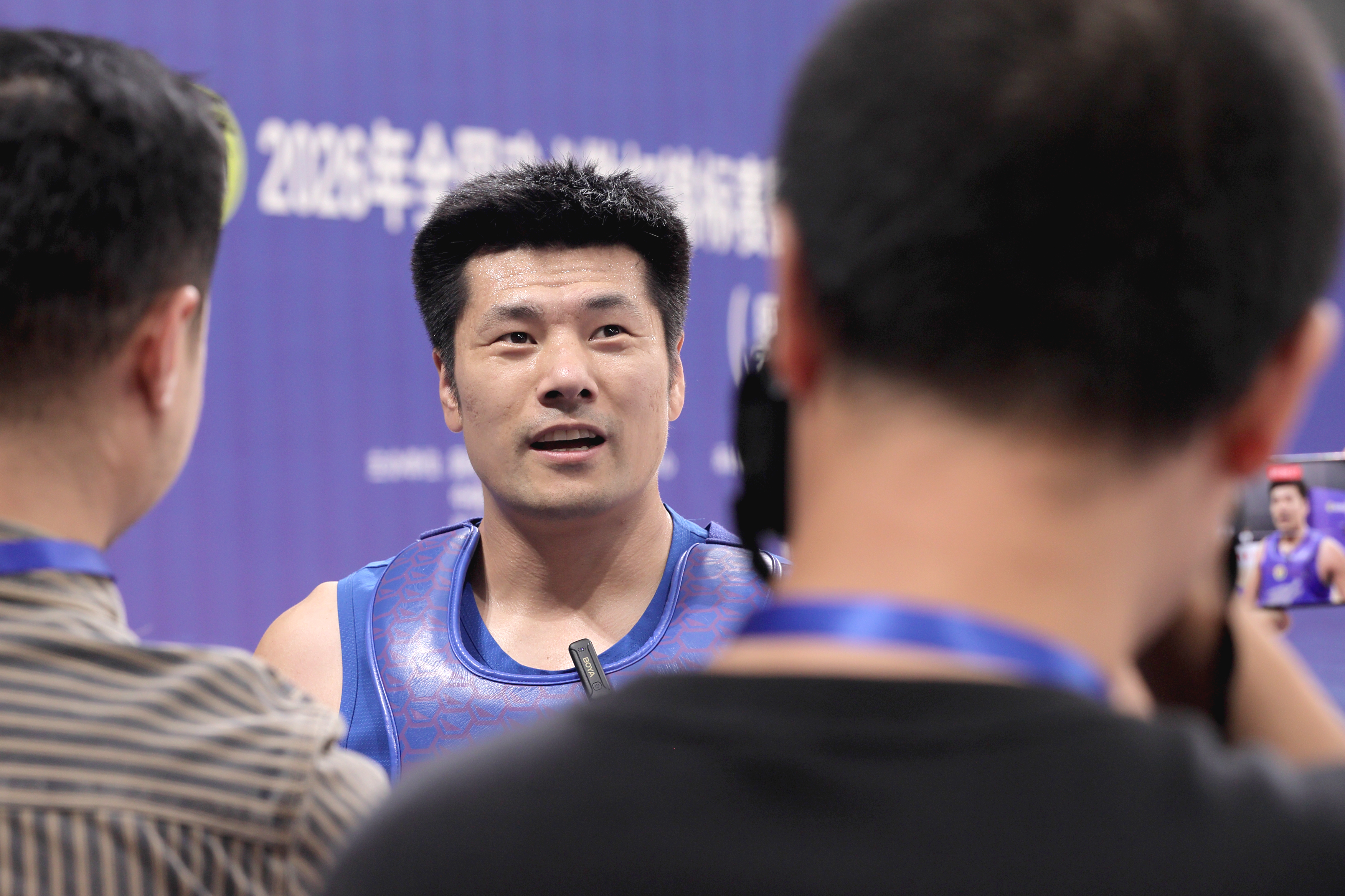 陜西代表隊(duì)運(yùn)動(dòng)員薛一龍?jiān)讷@得男子100公斤級(jí)金牌后接受媒體采訪